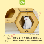 この猫ハウスは、猫にとって落ち着ける場所となるよう、設計・素材にこだわって開発されたものです。新しい家族との生活がより安心できるものとなるよう、猫ちゃんに「自分だけの居場所」を贈るという私たちの想いが込められています。